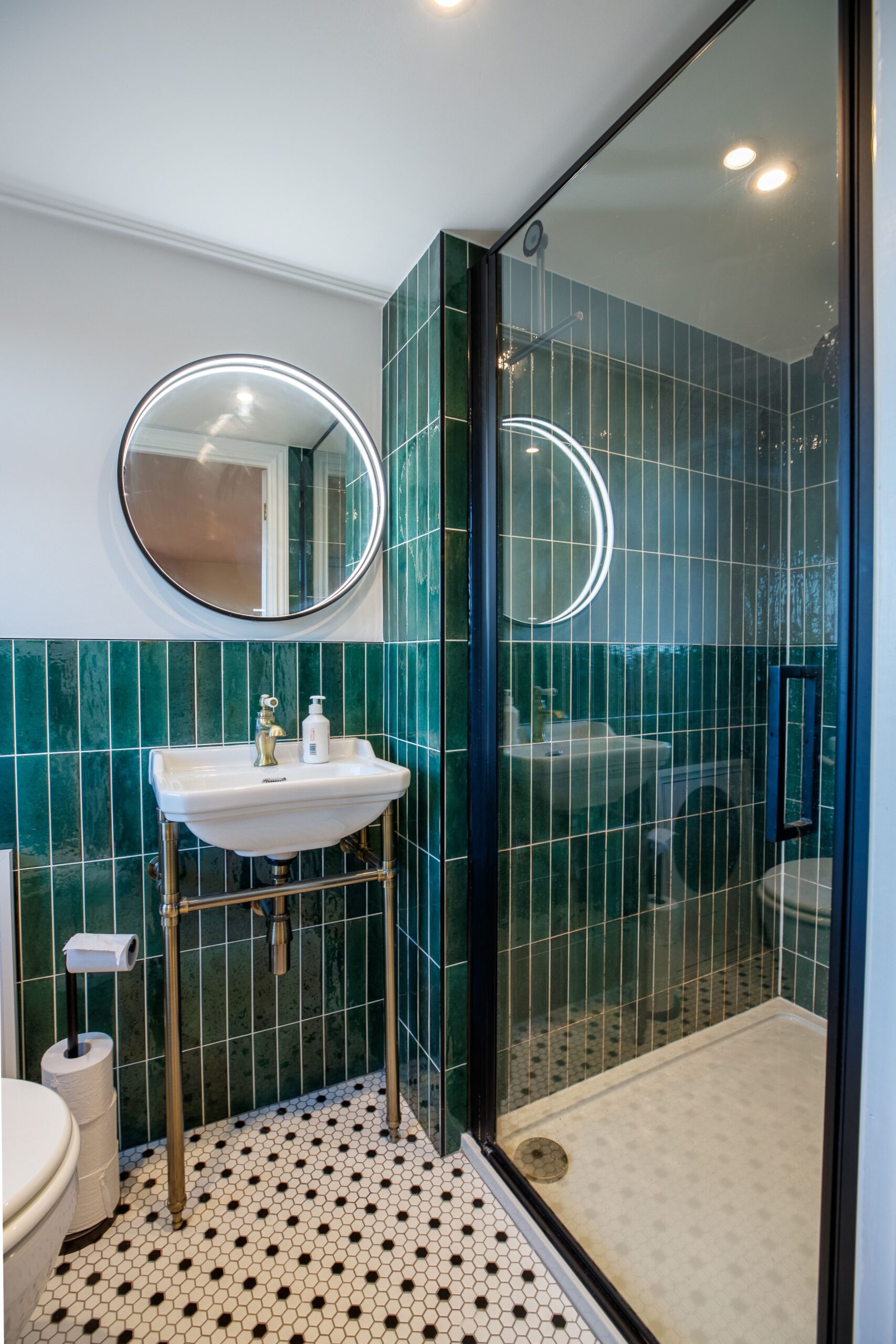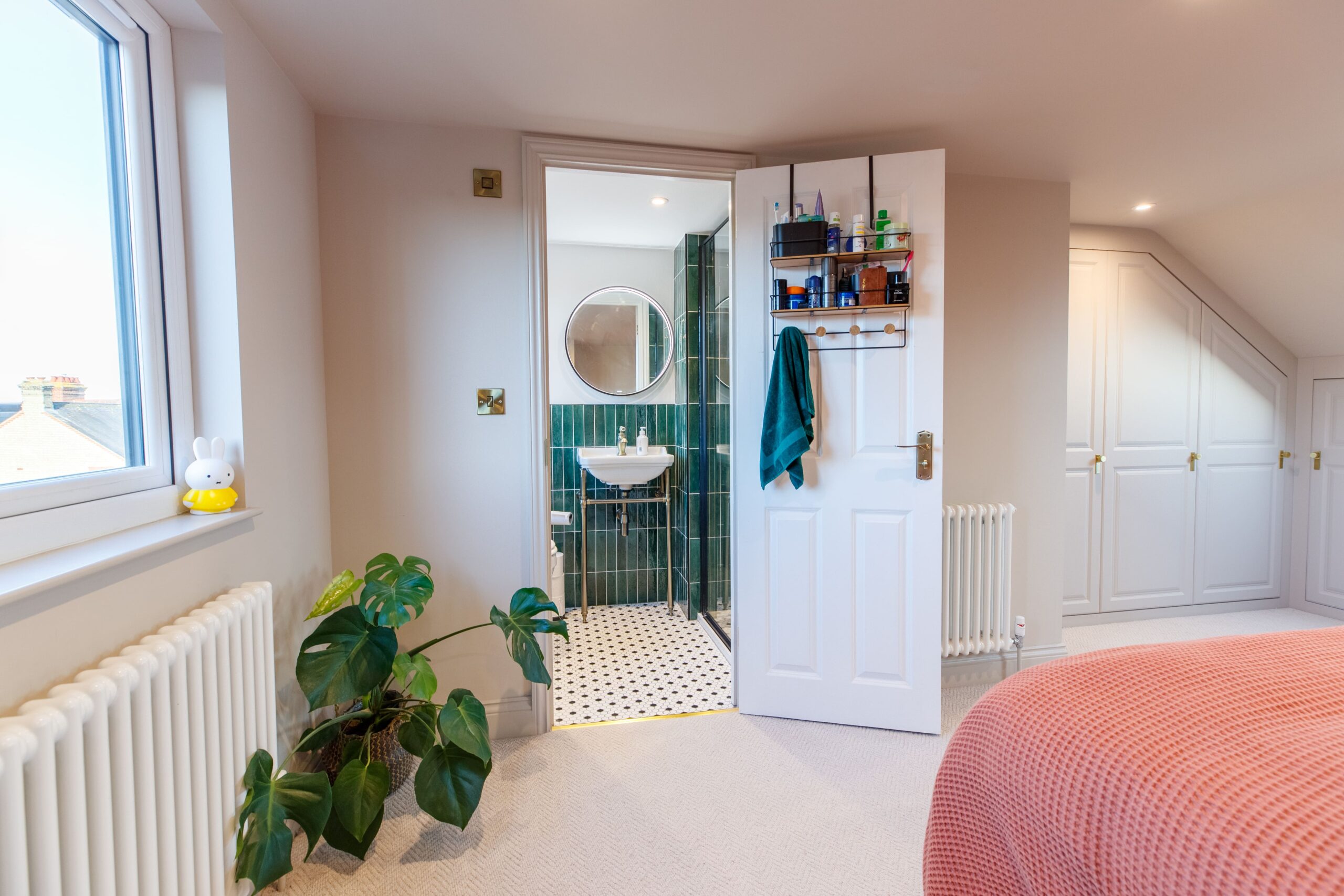 Inside, the new room is a bright, stunning space. With walls and ceiling painted the same colour, it feels open and welcoming. The ensuite bathroom was fitted with Victorian-style features and bold green gloss tiles, giving it a unique, modern twist that the clients absolutely loved.