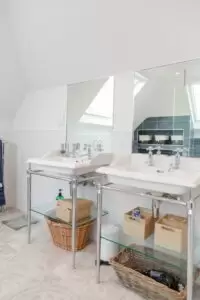 The bathroom/ensuite itself has a full wetroom shower that is 1.5m by 1.5m wide, with walk-in fixed glass, alongside a lovely period free-standing bath and his and her sinks. Next to this area, we also installed a small cloakroom-style toilet with a door. The bathroom was fully tiled, and we created a bench area with large soap boxes for towels and items. Overall, we’re really impressed with the size of this bathroom!